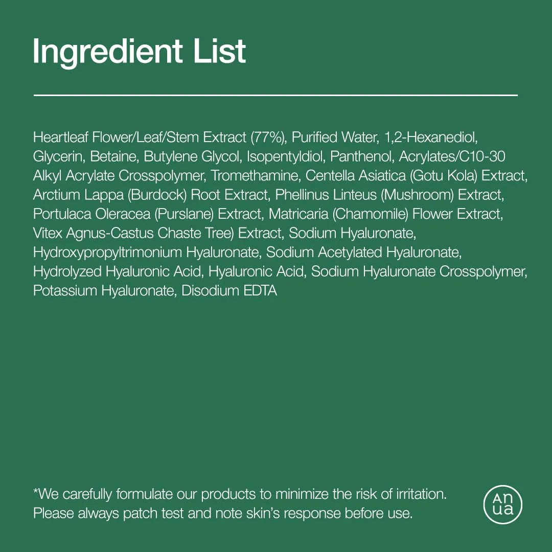 FORMULATED WITH NATURAL INGREDIENTS : Contains 77% Heartleaf Extract grown and harvested in Korea. Cruelty free, Vegan, Paraben Free.