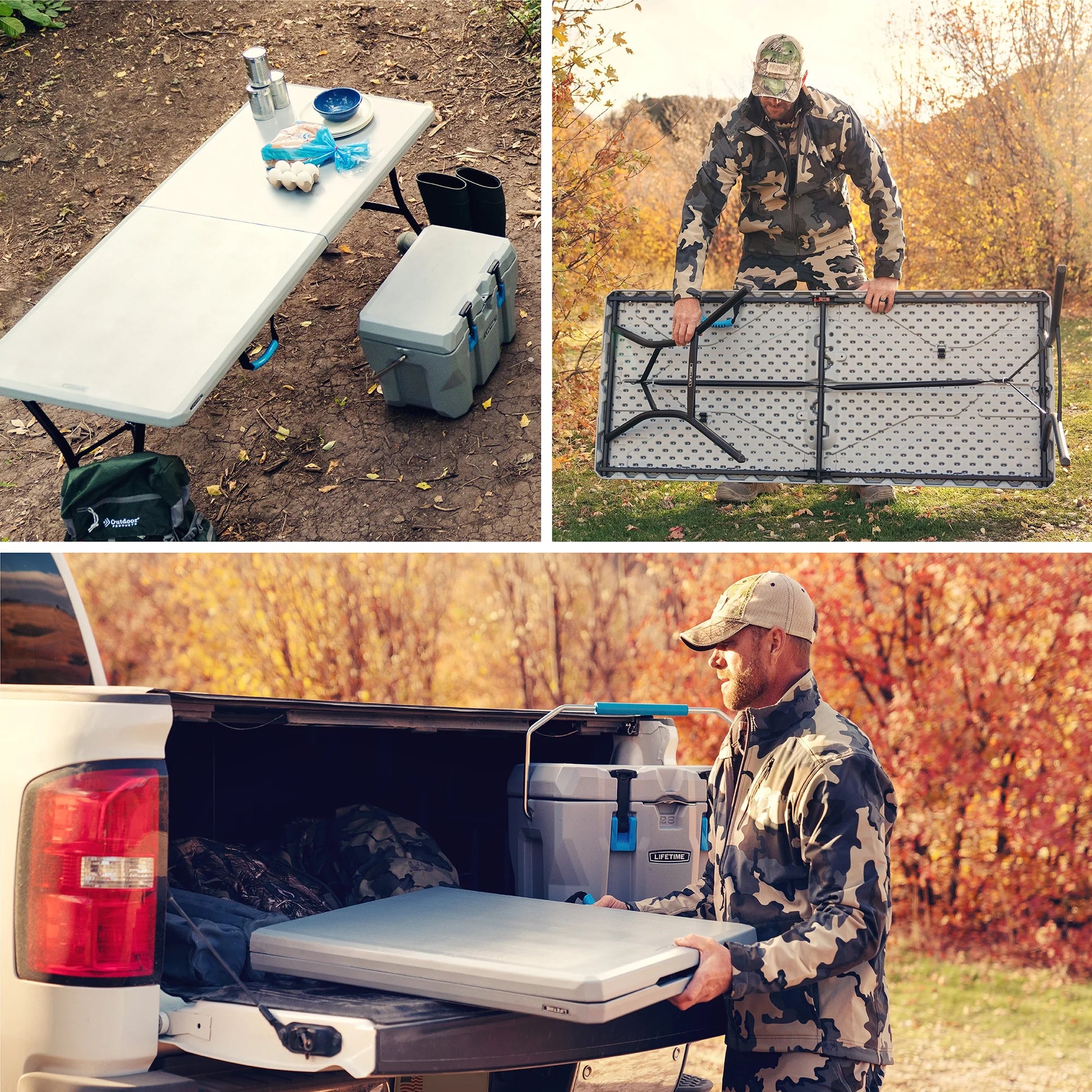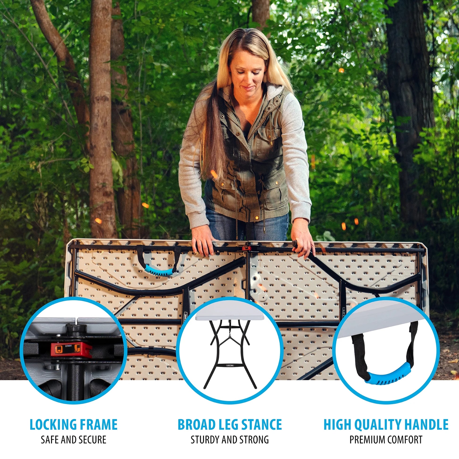 Lifetime’s 5-Foot Fold-In-Half Table is the perfect pair for your Lifetime Cooler. Whether you are roughing it on a camping trip or out tailgating with your friends and family, this table is the site for food and drinks. This table is part of the rugged line up and features a compact fold-in-half design and handles that makes it ideal for outdoor excursions. UV-protection, weather resistance, and stain resistance equips the table for heavy use. The impact-resistant edges and corners protect the table from damage so the table maintains its look and utility. The steel frame provides a sturdy foundation that is powder-coated with a weather-resistant finish. Lifetime’s 5-Foot Fold-In-Half Table is a great table for game day or any outdoor adventure.