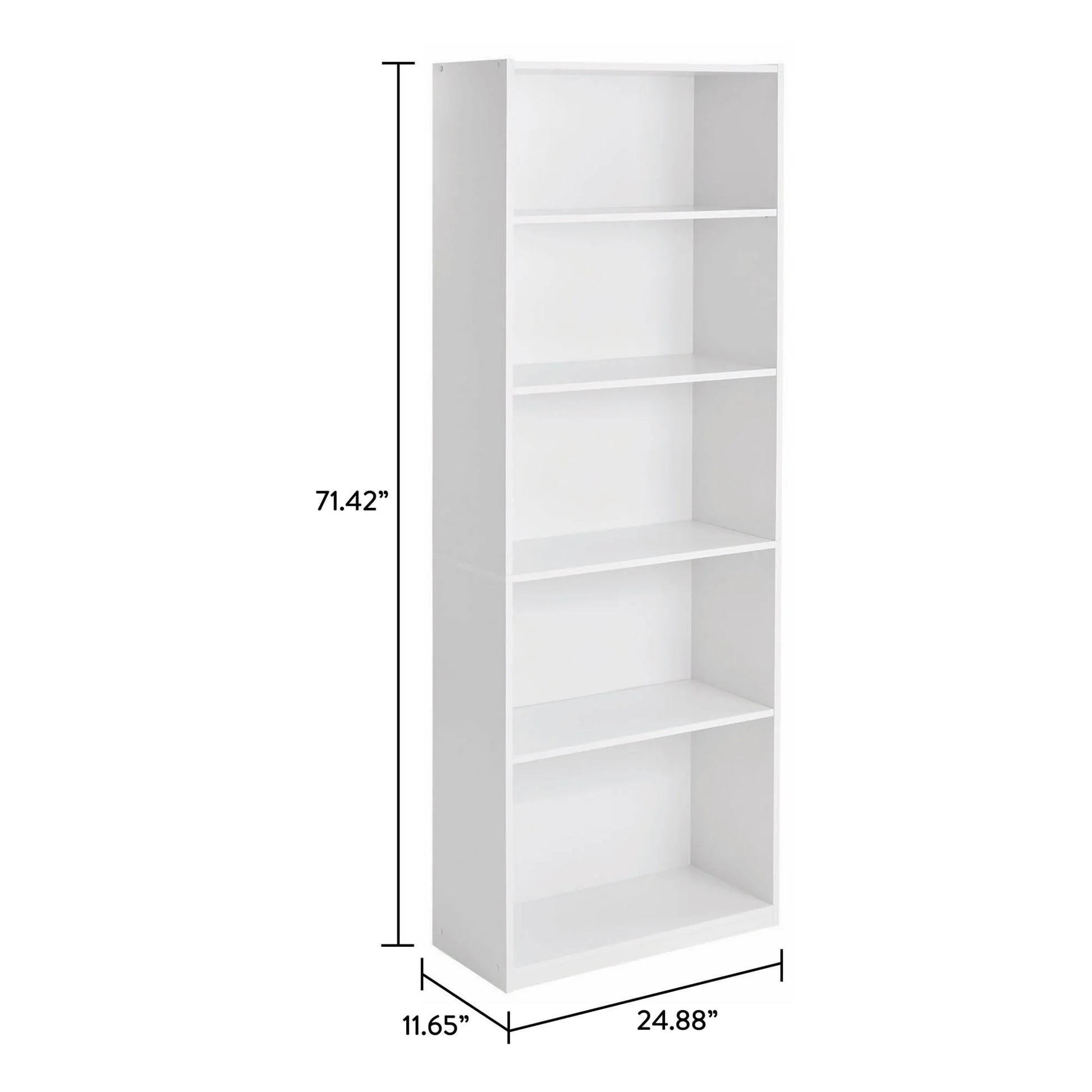 Add Mainstays 5-Shelf Bookcase with Adjustable Shelves to almost any room for a functional and stylish look. This sturdy storage unit has a closed-back design with 2 fixed shelves that hold up to 50 lbs each, and 3 adjustable shelves that support up to 35 lbs each. This attractive bookcase provides a useful storage option for any office, living room, family room, den and more. For safety, this bookcases secures to the wall with an included wall strap kit. The Mainstays 5-Shelf Bookcase stands 71" tall making it perfect for large rooms where smart, efficient storage is needed. The adjustable shelves accommodate everything from paperbacks to large folios to deliver a functional bookcase ideal for a variety of libraries and collections.