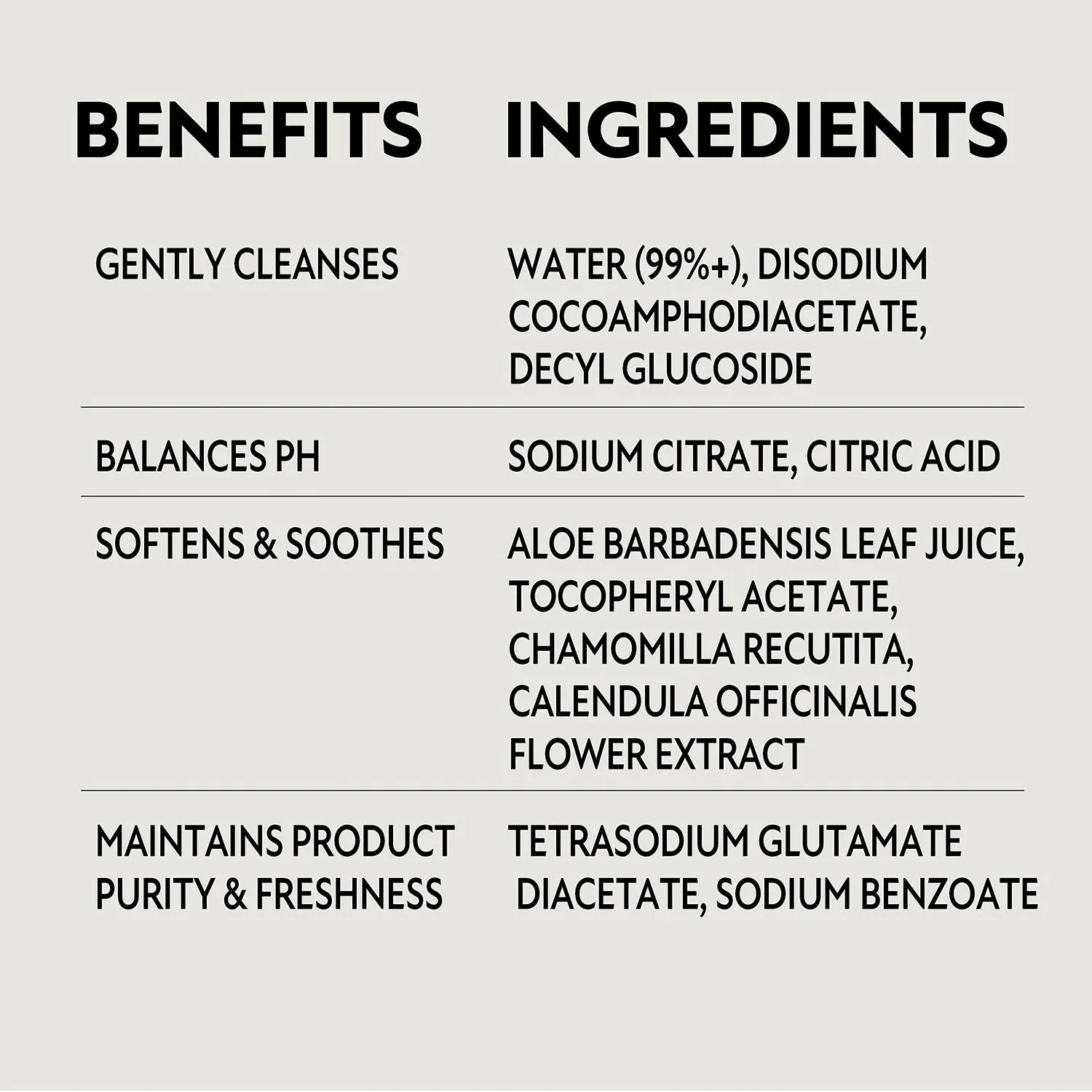 Ingredients: Water, Sodium Benzoate, Tetrasodium Glutamate Diacetate, Disodium Cocoamphodiacetate, Decyl Glucoside, Citric Acid, Sodium Citrate, Aloe Barbadensis Leaf Juice, Tocopheryl Acetate, Chamomilla Recutita (Matricaria) Flower Extract, Calendula Officinalis Flower Extract