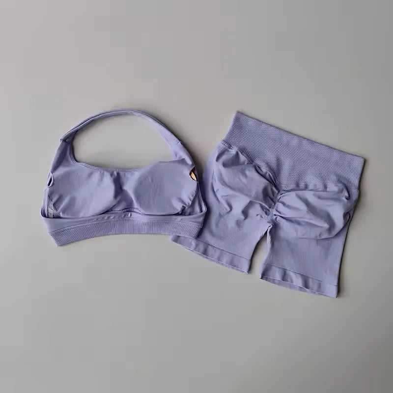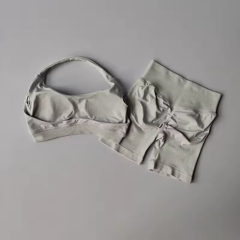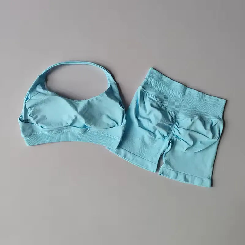 Redefine your activewear wardrobe with our Sexy Halter Neck Sports Bra & High-Waist Shorts Set — where fitness meets fashion.