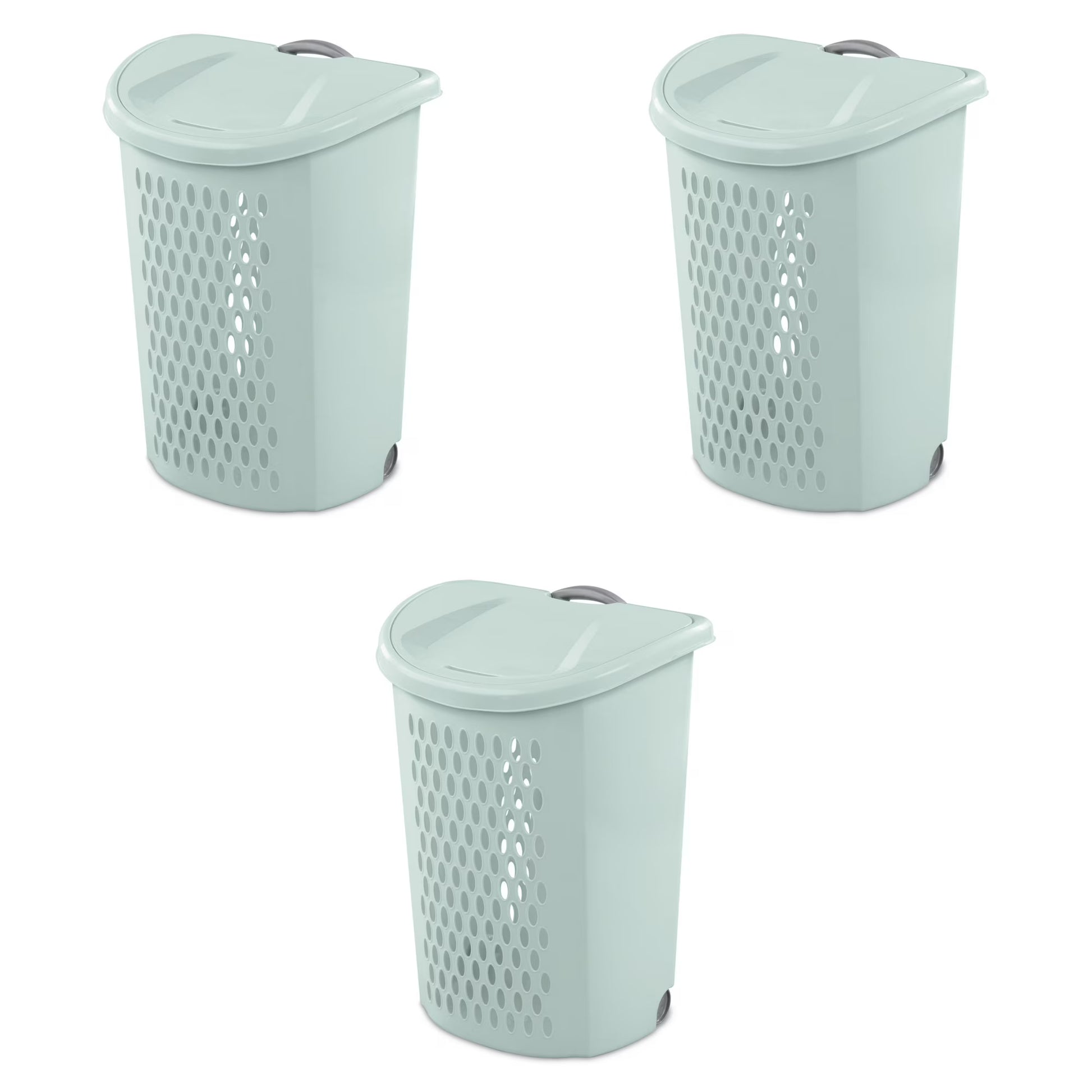 Sterilite 3-Pack Ultra Wheeled Hamper, Laundry Basket w/ Flip-Top Lid & Retractable Handle - Plastic Rolling Clothes Storage Cart with Ventilated Holes for Home, Apartment or Dorm
